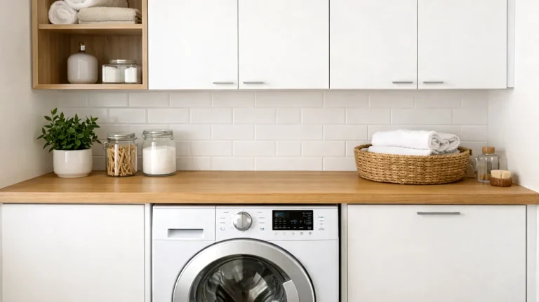 Un piano in legno massello, in laminato effetto rovere o in marmo posato sopra la macchina trasforma uno spazio inutilizzato in una superficie funzionale: ideale per riporre i detersivi, piegare il bucato appena estratto o appoggiare temporaneamente cesti e accessori. Questa soluzione è particolarmente efficace nelle lavanderie compatte, dove ogni centimetro quadrato conta.